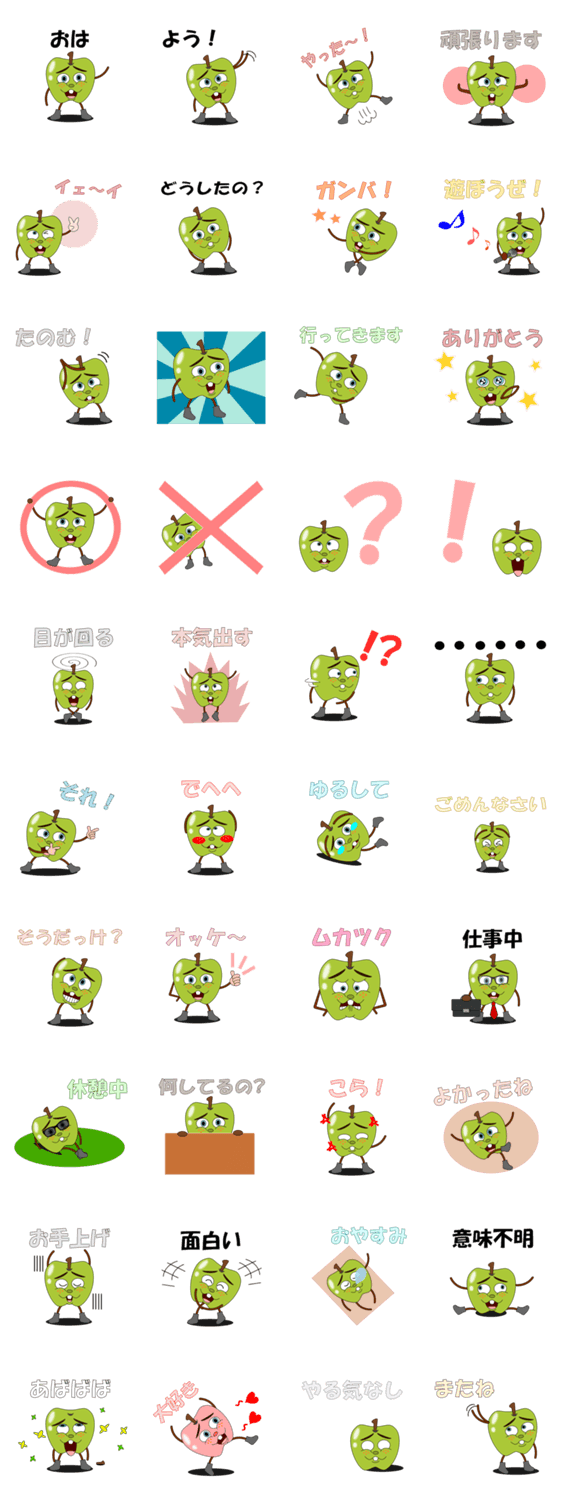 ちょっと憎たらしい青リンゴさんのスタンプ。あいさつやトークでよく使うスタンプが中心です。会話の返信用や誘うときになどお使いください。
