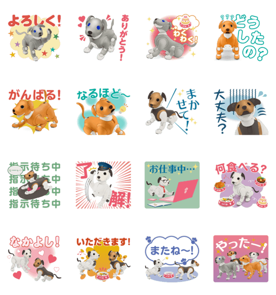| スタンプ説明 | エンタテインメントロボットaiboのオリジナルスタンプ第3弾! 限定カラーのaiboたちも加わり、さらに賑やかになりました。 |