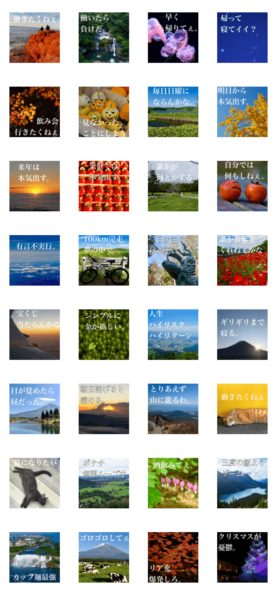 風景写真を背景にダメ人間のつぶやきをのせたスタンプです。