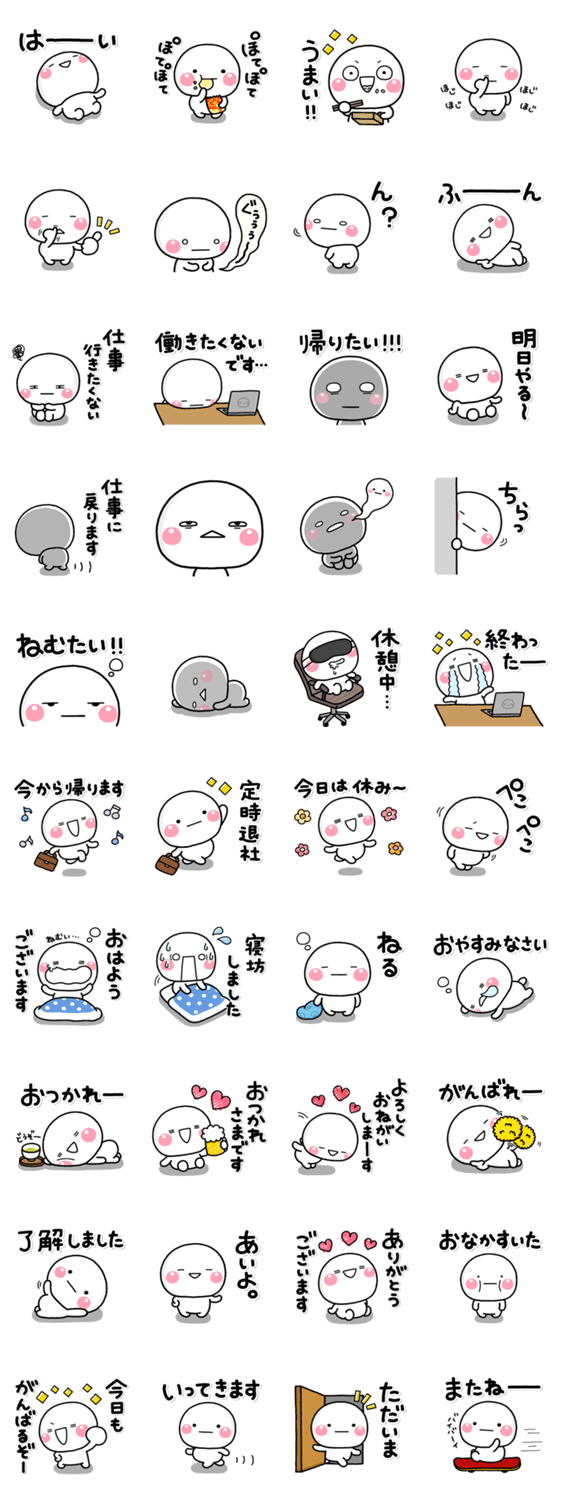 | スタンプ説明 | いまいちやる気が出ない時に使えるしろまるのスタンプです。【作:いしいともこ】 |