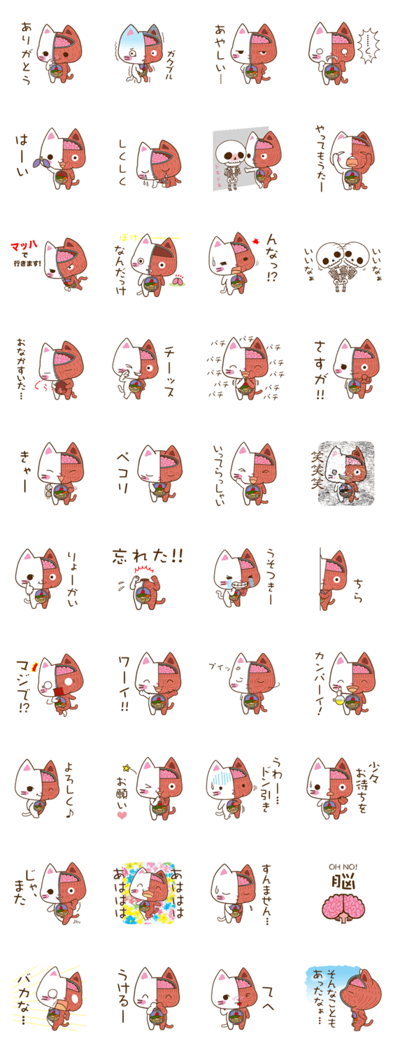 | スタンプ説明 | 人体模型ならぬ、猫の全身標本です。ちょっぴりホラーでキモいけど、どこかカワイイ、キモかわ系ネコちゃんスタンプです。 |