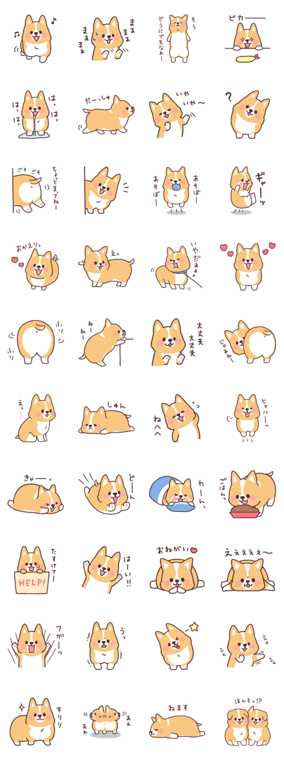 まるまるしたコーギーのかわいい表情いっぱいのスタンプです。