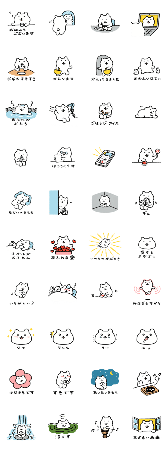 暮らしをがんばりすぎず なんとか日々を生き抜く しろくまのスタンプです。あかるい未来を願って 自分なりのペースで 今日もすこやかに生活をしています。