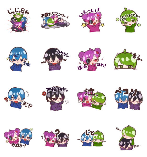 | スタンプ説明 | ※非公式スタンプです じゅじゅ日和の4人 ぶりちゃん matsuさん カムイさん 零さん |
