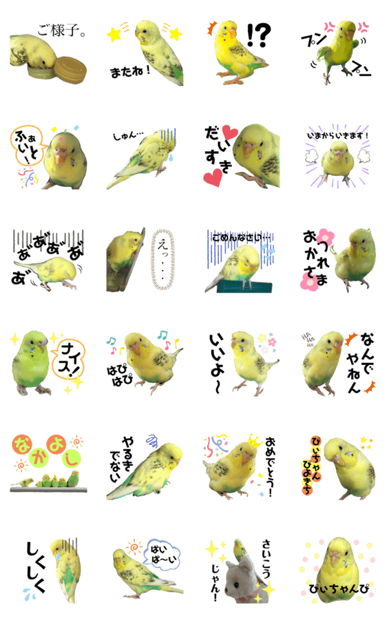 セキセイインコのぴぃちゃんスタンプ第二弾です。ぴぃちゃんのちょっと変な行動もスタンプになりました。かわいいですね♬