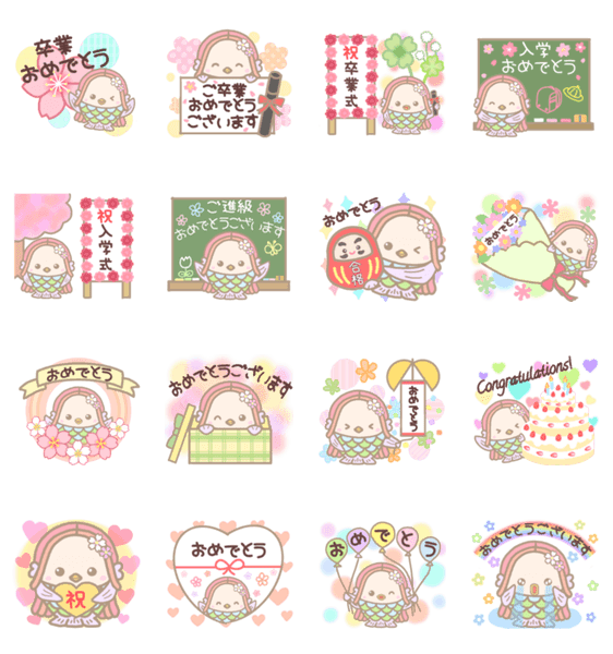 カワイイあまびえちゃんのお祝いスタンプ。合格、卒業、入学、誕生日等に使えます。