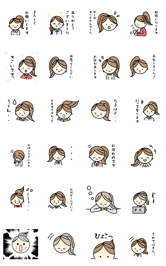 先輩や職場の人、年上の人やママ友など、タメ口で話しにくい相手に送りやすい女性スタンプです。