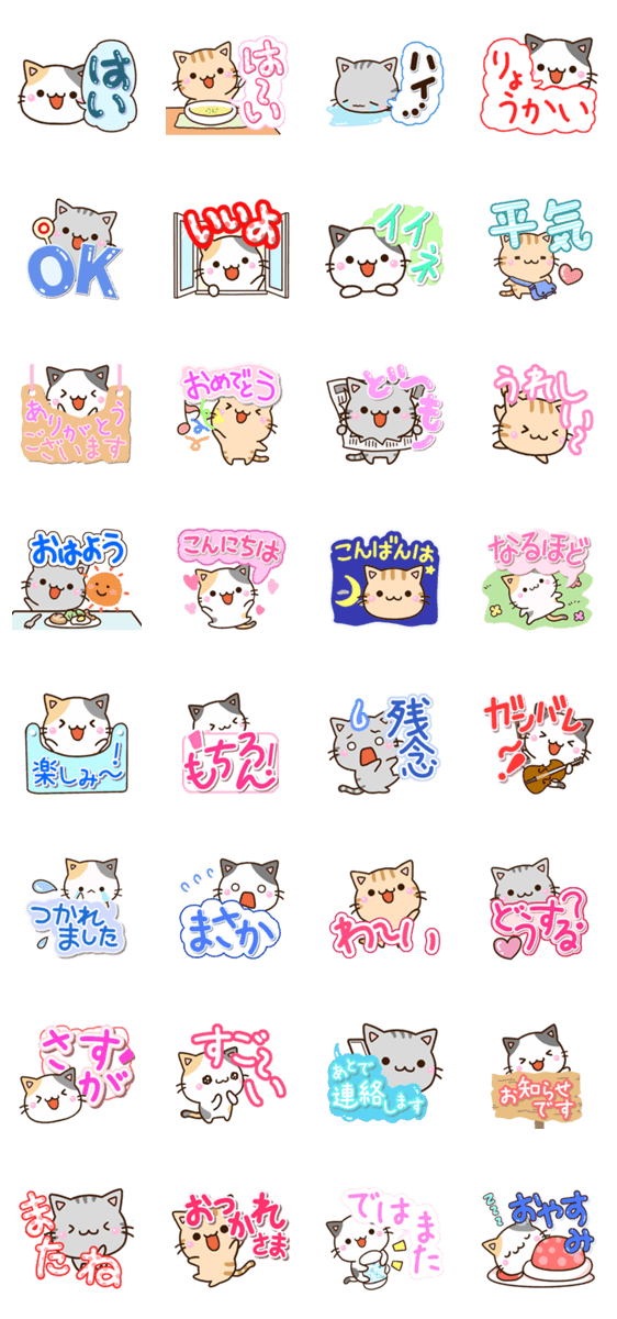 『ちびミケ』『ちびトラ』『ちびアメ』『ちびブチ』スタンプの猫がそれぞれ登場するスタンプです。基本的な言葉を集めました。ネコ好きな方にぜひ。【かたこ】