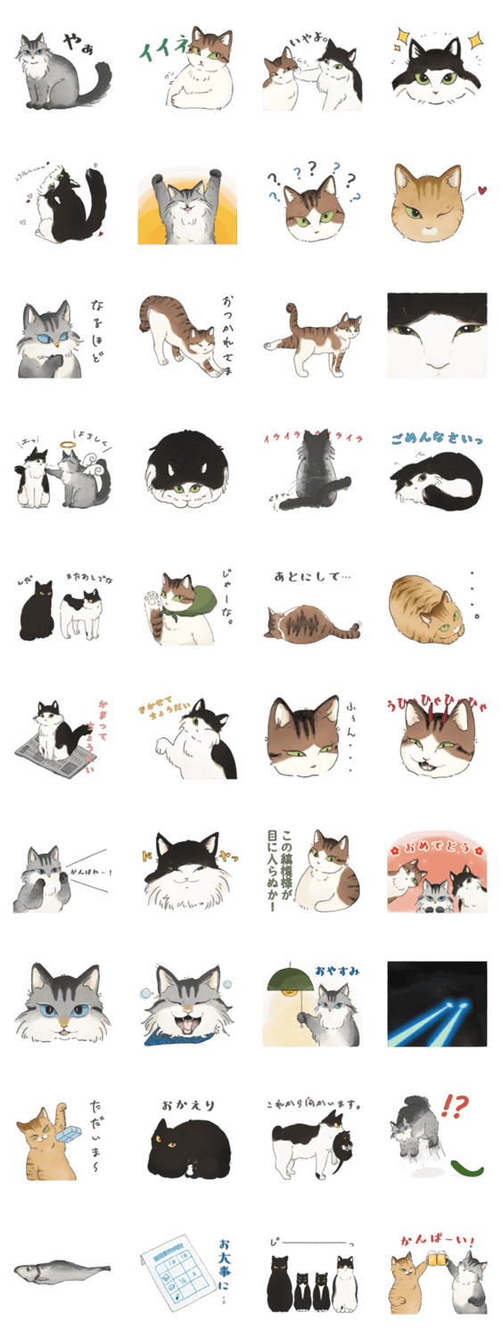 たま、もく、りん。おおもり家のネコたちとおともだち。 使いやすいスタンプと煮干し。