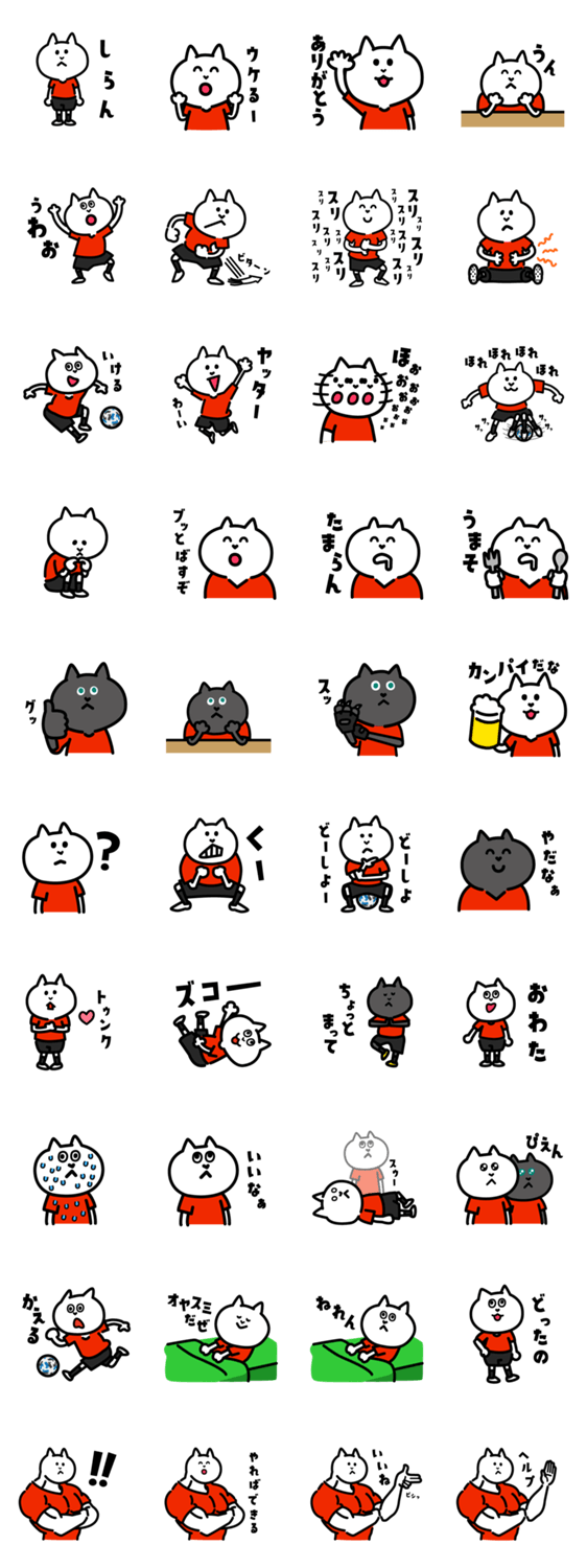 サッカーが好きなネコのスタンプ。 鯱な赤色のチームを応援するネコ(ヒト)に。