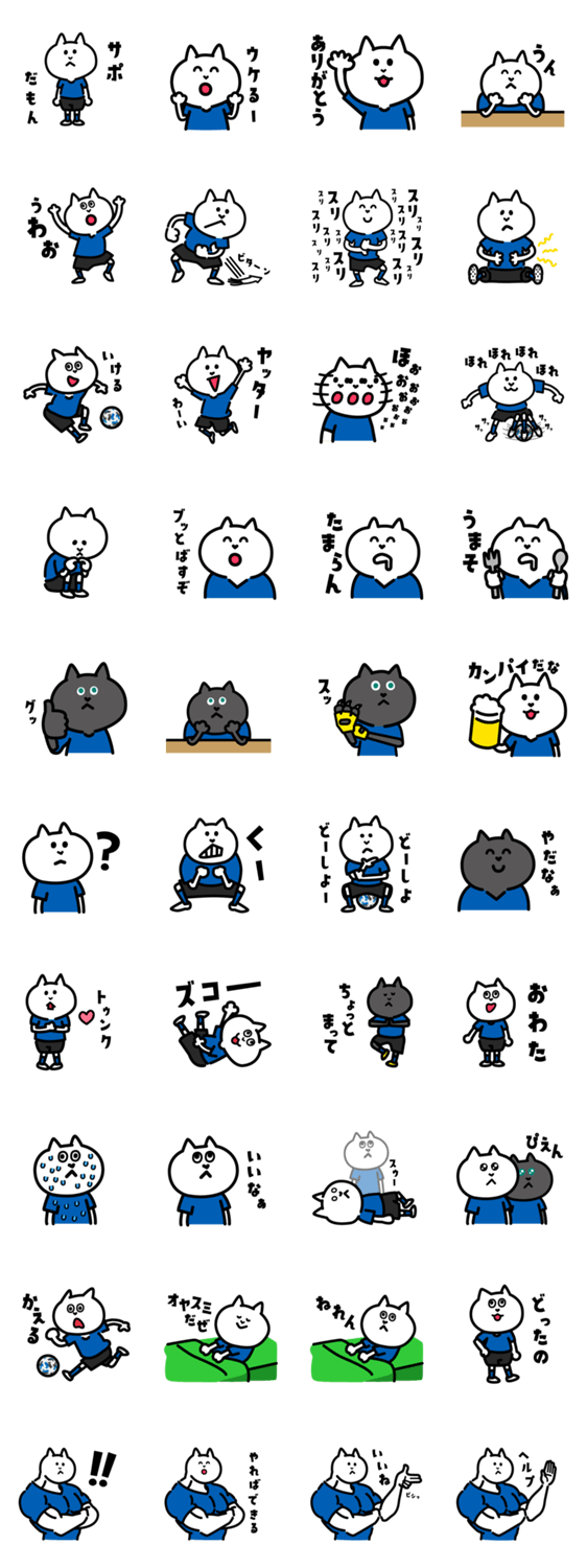 サッカーが好きなネコのスタンプ。 青と黒(黄色も…)のチームを応援するネコ(ヒト)に。