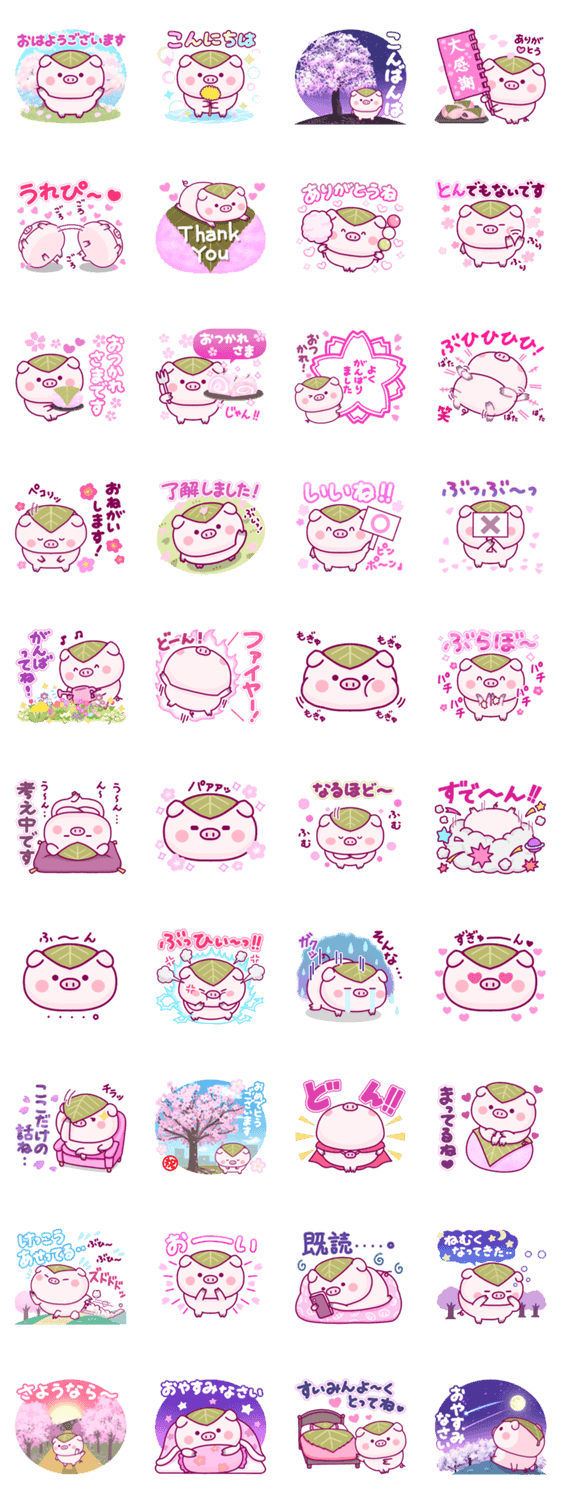 桜餅のような春担当の豚ちゃんです。甘えん坊でいつもぶひぶひしてます。よろしくね。(※こちらは期間限定で販売していたスタンプの再販売となります。)