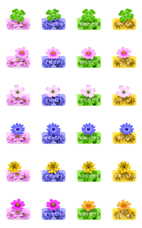 | スタンプ説明 | スマホの上で四季の草花が風に揺れているように見えるスタンプです。このバージョンでは《吹き出し》の背景を動く草花で飾りました。 |