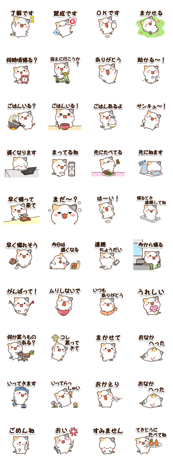 まるい、ぽっちゃりした三毛猫『まるミケ』スタンプの、【家族連絡】編になります。家族、兄弟、友人、恋人同士で使いやすい、連絡用ねこスタンプです。【かたこ】