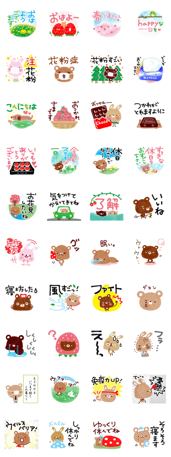 春・あたたかくなる季節に、楽しく使えるスタンプセットです。 ~花粉症・いちご・お花見・挨拶~