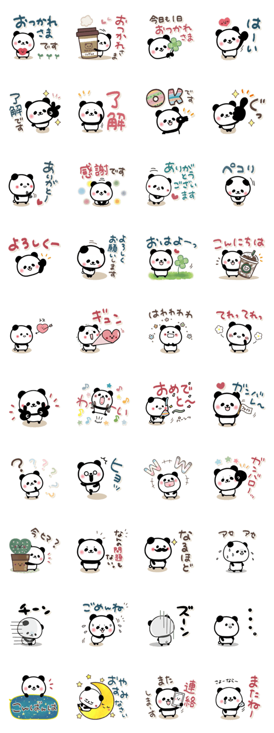 パンダの詰め合わせです♪毎日使える言葉のセットの使いやすいスタンプです。#はじめてのLINEスタンプ にオススメ