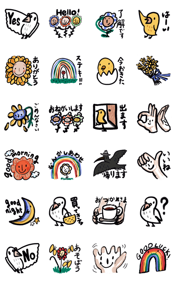 花、鳥、太陽、月、虹、原っぱに集まるかわいいキャラクターにシンプルなフレーズを添えたスタンプ。毎日使いやすく、使うほどに日々の小さな幸せを見つけられるかも。