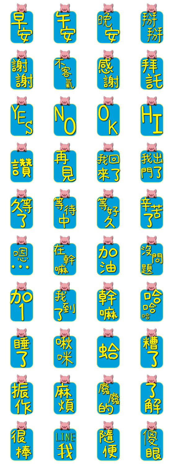| スタンプ説明 | Extra-large-character Little Pig Everyday Phrases dialog box with yellow words on blue background These stickers will show up extra large in chats. |