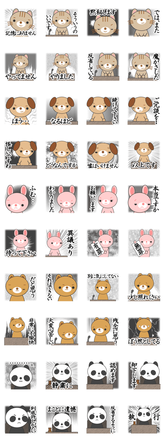被告『罪ねこ』をいぬ検事が追及 弁護士うさぎ100%敗北確定?なるか、逆転 裁判長ぱんだがどんな事件にしろまるっと判決 カギを握るのは証人くま!? そんなスタンプです