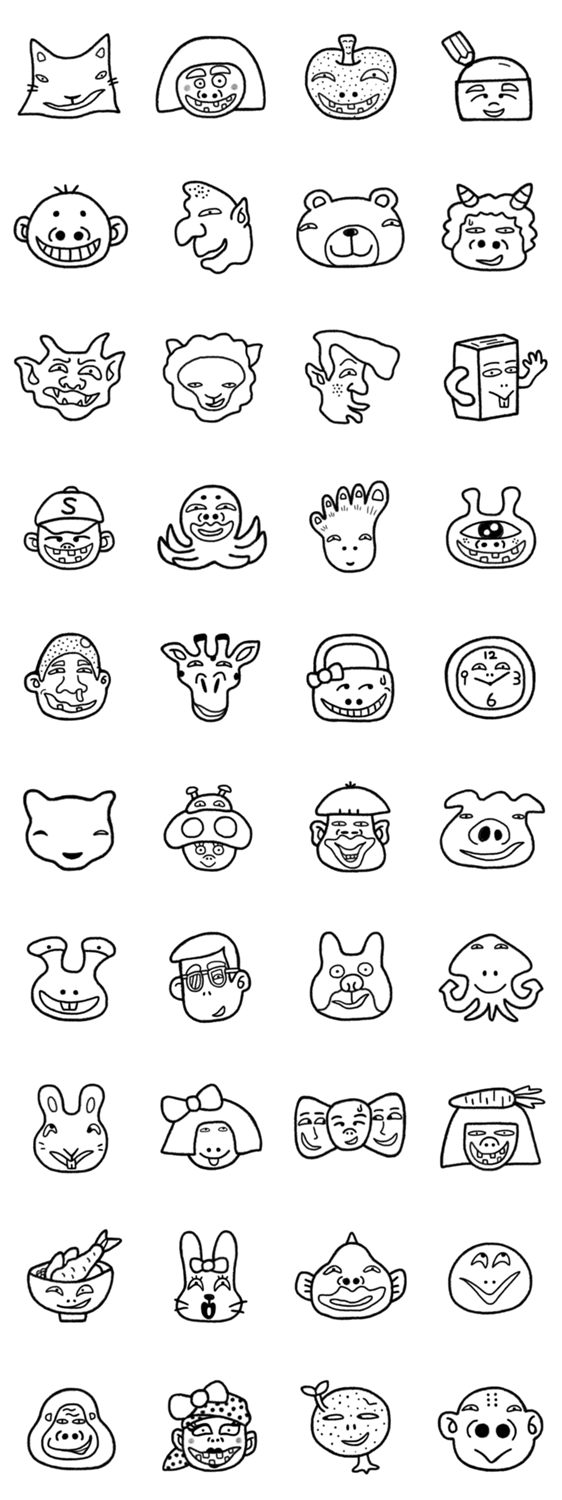 くま、うさぎ、猫、ゴリラ、ブタ、宇宙人、、、いろんな生き物の笑顔のスタンプです。なんでも対応できると信じています。