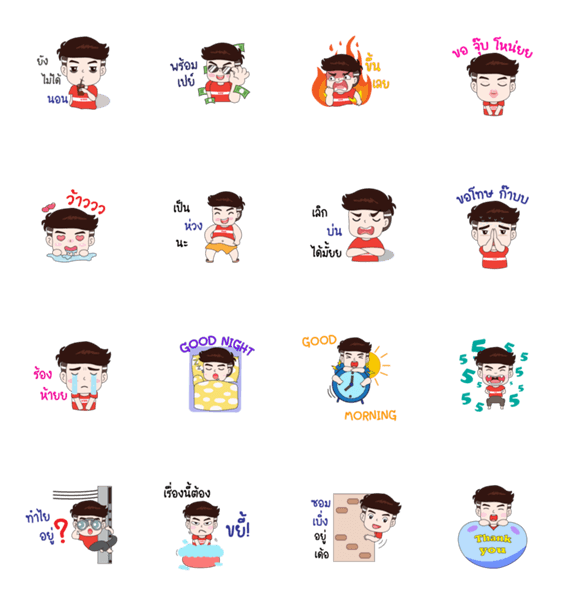 Sticker of male cartoon characters that express emotions and words.