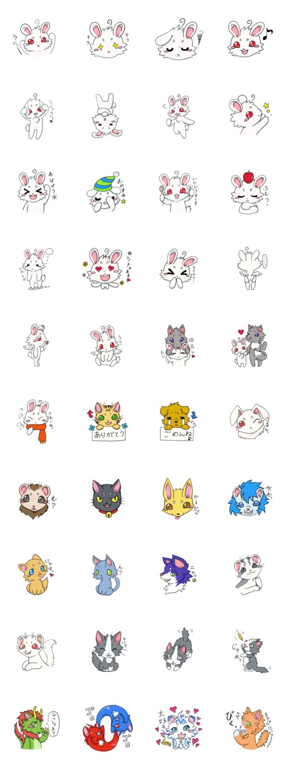 まろまゆのケモノ達のスタンプ。色んなケモノやハチワレ猫、幸(コウ)ののんびりスタンプです。