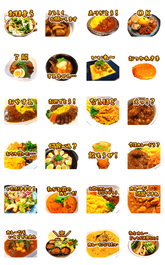 | スタンプ説明 | とにかくカレーが大好き!カレーな時でもそうじゃない時でもいつでも使えるスタンプです。カレーライス&ばる しえすたのカレーを使用しています。 |