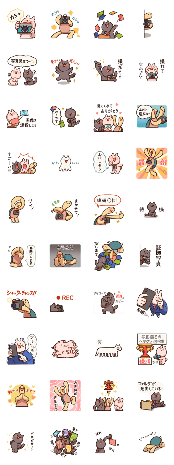 紳士なうさぎ「うさまっちょ」とカメラ撮影をすることが好きなかめさんのLINEスタンプです。写真を送りあう際にぜひお使いください。