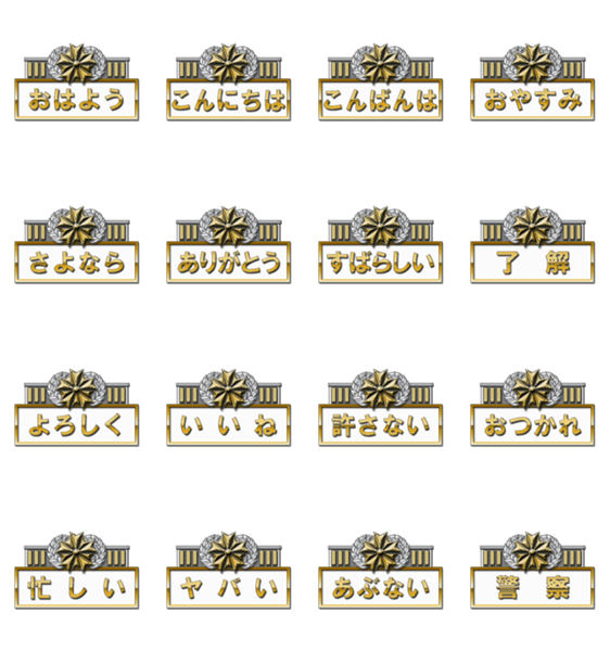 お巡りさんがつけてそうな警察官風のピンバッジにワードを添えました。メタリックな質感を表現し、リアルにしました。
