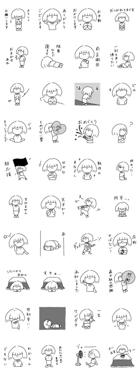ヒダリちゃんのゆるーいスタンプ、第二弾です。挨拶系多め。相棒のオカメインコもひっそりがんばってます。