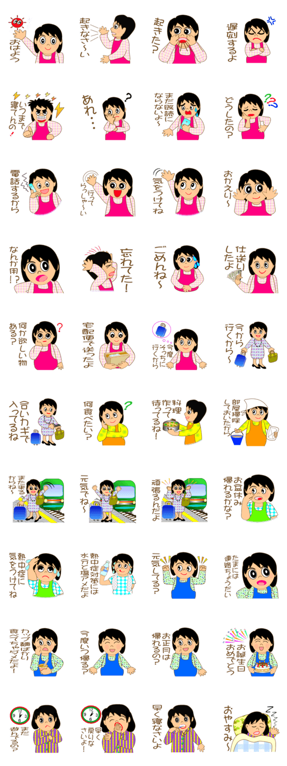 家族から離れて一人暮らしをしている息子や娘、単身赴任中の夫、家族を心配してお母さんが、送る愛情たっぷりのスタンプです。母さん、ママさん、おかんにお勧めです。