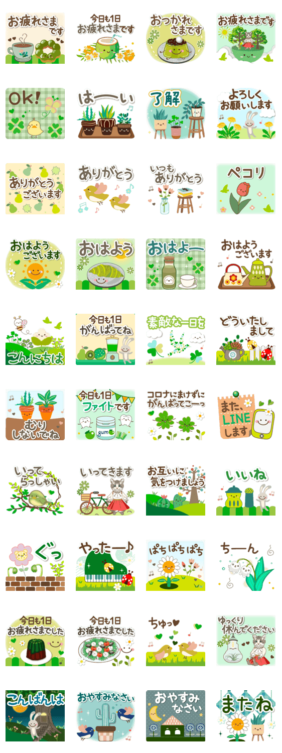 | スタンプ説明 | 抹茶スイーツや緑色のフルーツ、グリーンプラントで癒やされませんか。毎日使える挨拶スタンプになっています。 |