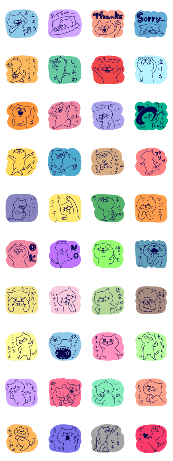 ぶさかわ猫がトークをカラフルに彩ります!ゆるく楽しく使ってくださいね。