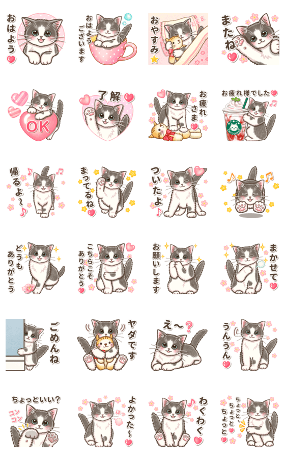 やさしい子猫のポップアップスタンプ3です♪大切なご家族やおともだち、大好きな人へのあいさつや日常会話で使いやすい言葉をたくさん集めました♡