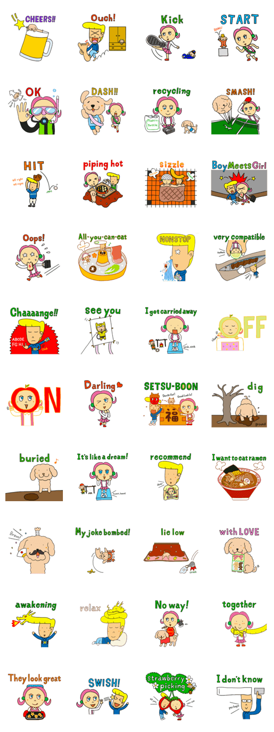 | スタンプ説明 | ポップでかわいい女の子キティとそのボーイフレンドのジャック、愛犬パピーの英語スタンプの第四弾です。 |