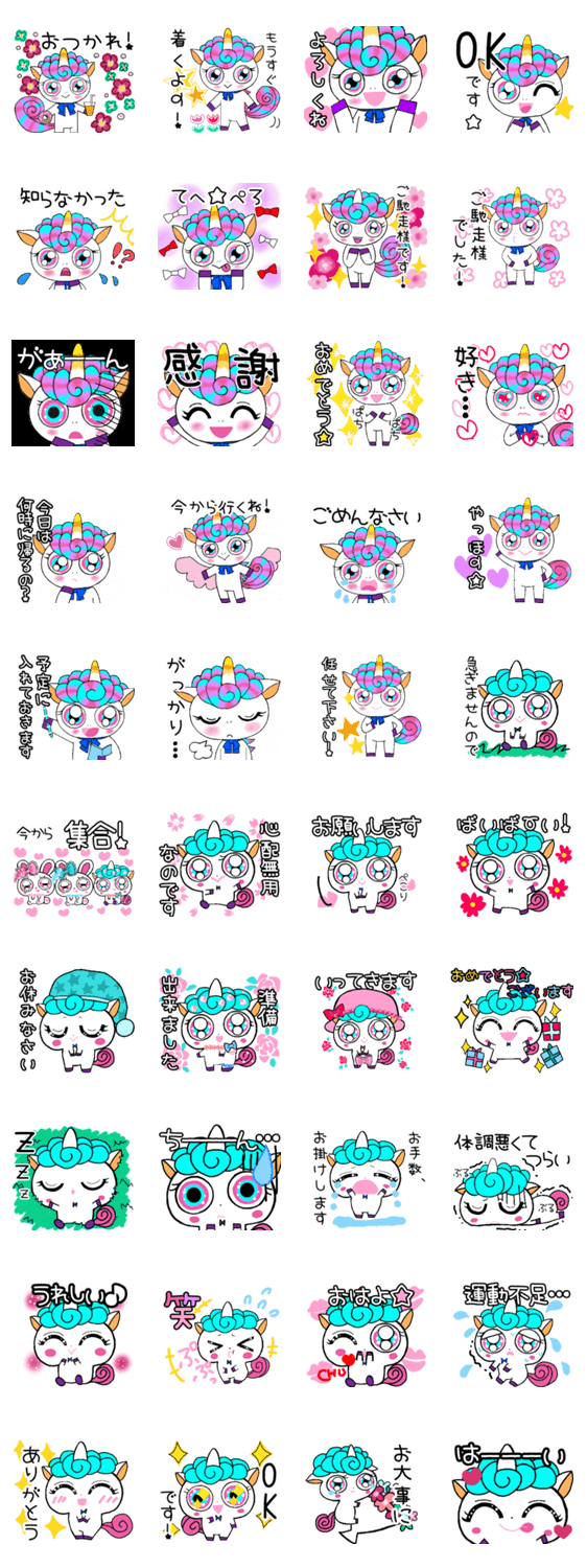 ユニコーンキャラクターの、日常でよく使う言葉のスタンプです。