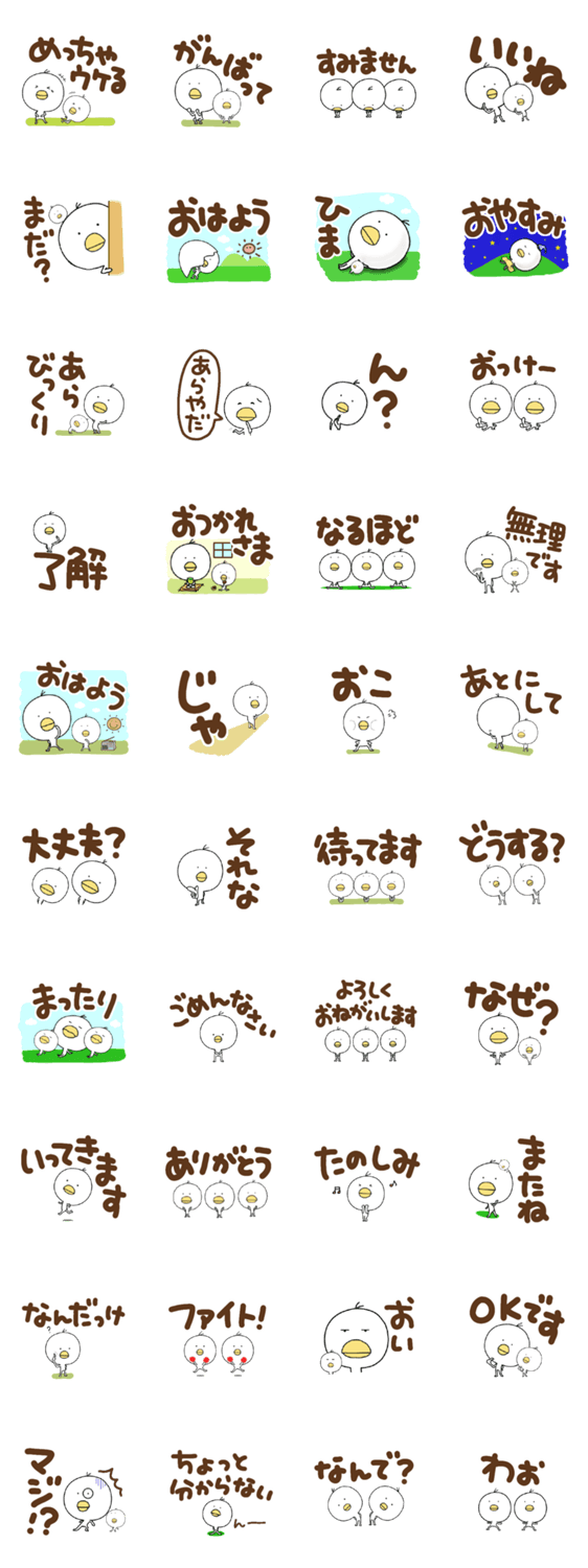 ひよこたちのいろんなポーズが楽しいスタンプ。日常会話からリアクションまで毎日使えるものばかりです。真似するちびぴよも可愛いです。