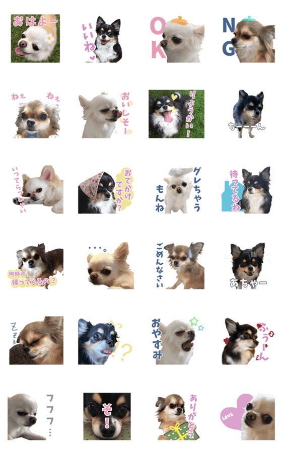 チワワ3ぴきの写真スタンプです。何でも許しちゃいそうな表情で日常会話を楽しんでください。