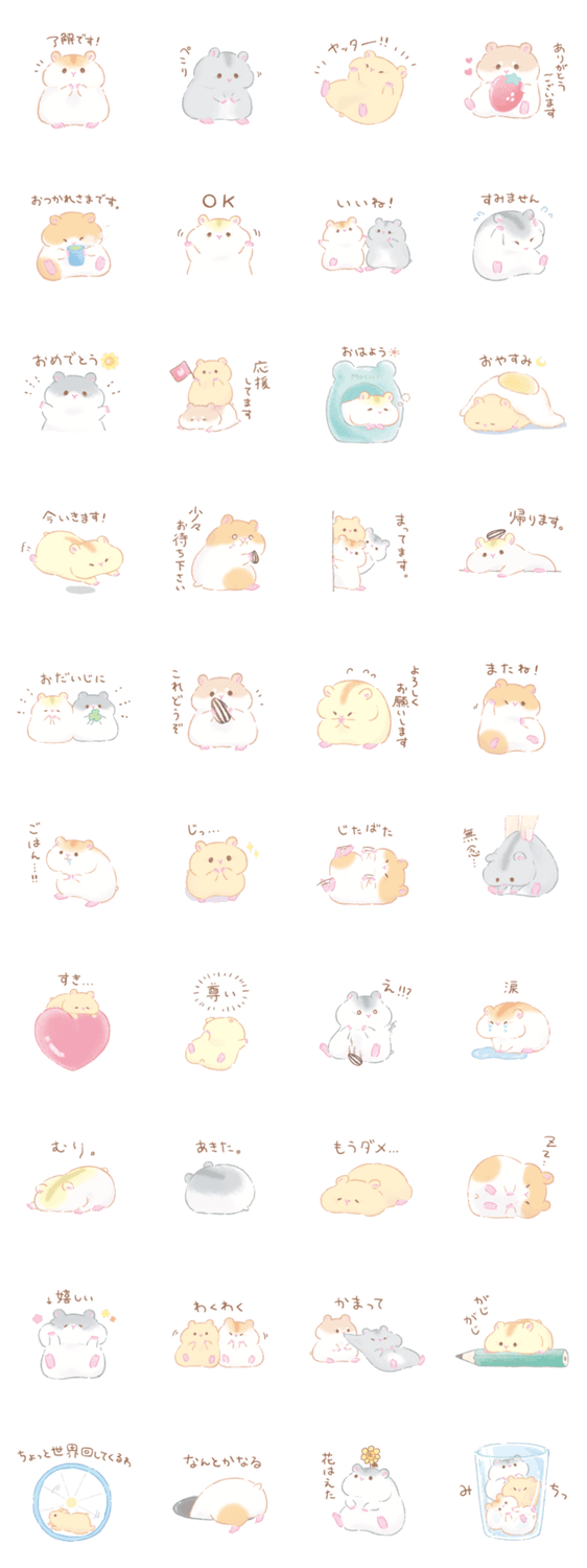 むきゅ~♡っとやわらか~い“ やわ♡もっちハムスター ”がスタンプになりました ! 日常会話にも使いやすい、もちもちのかわいいハムちゃんたちです。