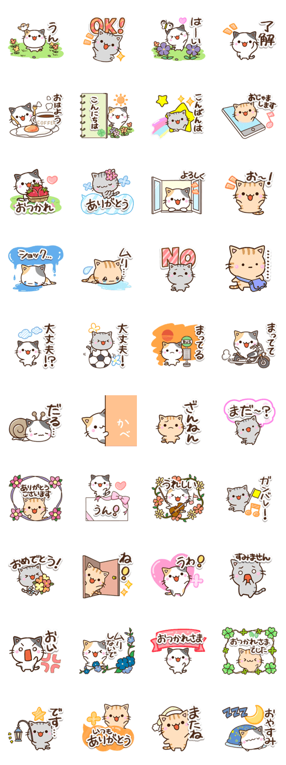 『ちびミケ』『ちびトラ』『ちびアメ』『ちびブチ』スタンプの毎日使える猫スタンプです。可愛い飾りや花等、よく使う言葉のネコスタンプ。ねこ好きな方にぜひ。【かたこ】