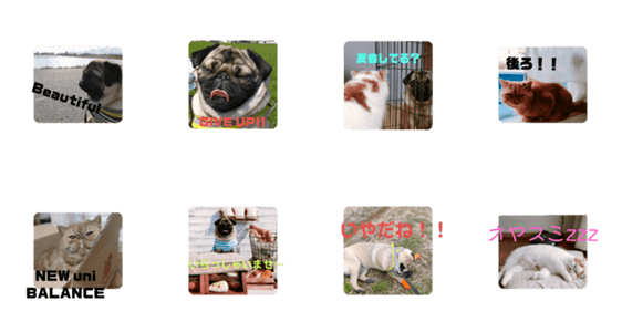 LINE Creators Studioでつくったうちのわんにゃんスタンプです。うに(茶ねこ♂)いくら(白茶ねこ♂)わかめ(パグ♀)です。