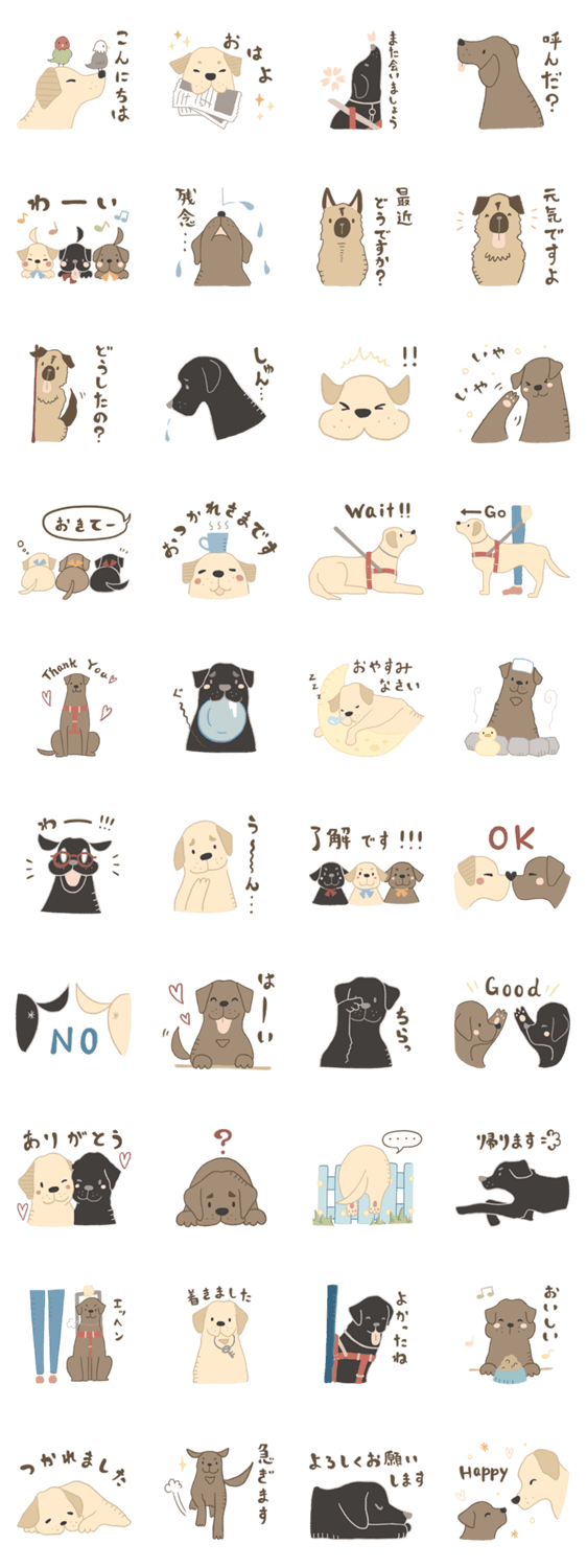 アイメイトは日本で最も実績と歴史のある(公財)アイメイト協会の盲導犬です。現役アイメイト、候補の子犬、リタイア・不適格により家庭犬となった犬たちのイラストです。