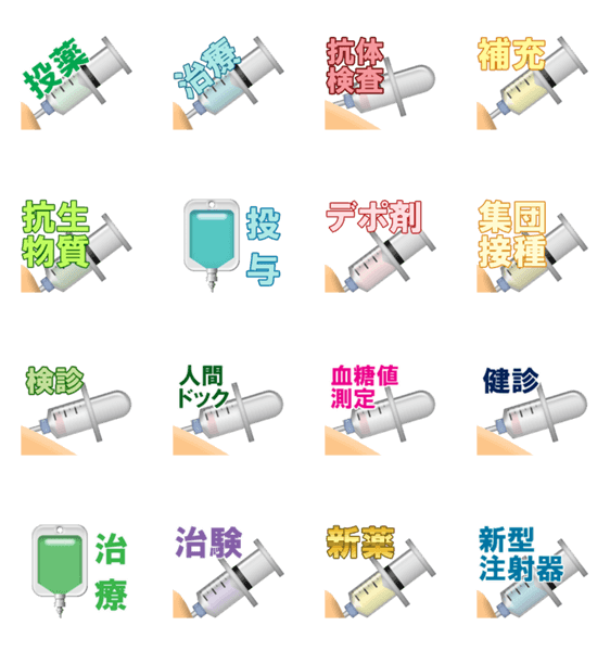 病院のワクチン接種の注射器や血液検査キット、点滴などのアニメです。医療や看護のステッカーです。医者や研究者から一般人にまで。