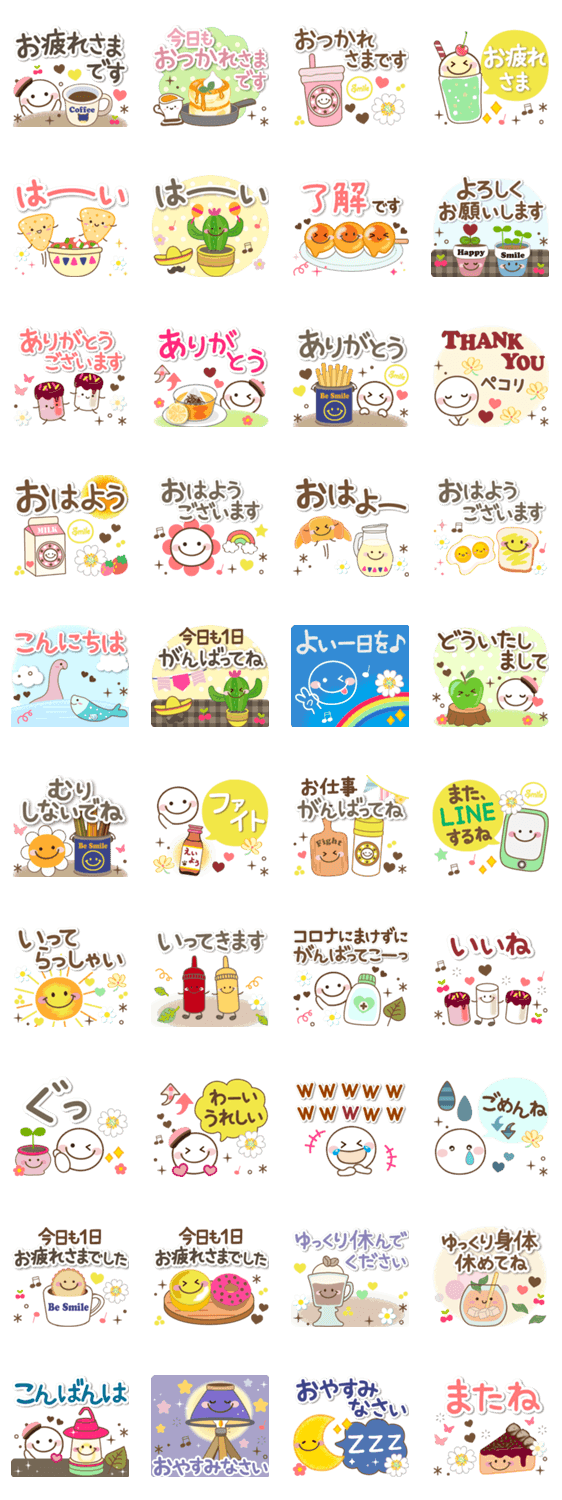 | スタンプ説明 | 毎日のハッピーな生活を彩るスマイルの挨拶スタンプです。食べ物やグリーンをスマイルな笑顔の優しいデザインで作りました。小さな幸せにおすすめ♪シンプル・大人可愛い |