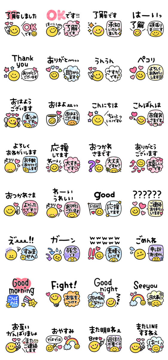 スマイルがいっぱいのカラフル☆スタンプです‼︎ よく使う日常言葉を集めました♡ 吹き出し/大人可愛い/かわいい/ハート多め/家族/友達/カップル/連絡用