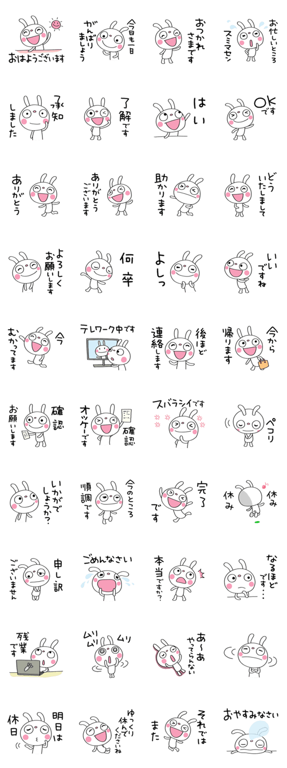 | スタンプ説明 | ふんわかウサギ。仕事で使える編。「テレワーク中です」「完了です」から「ペコリ」まで。お仕事で使いやすい言葉がいっぱい。家族、学校、お仕事でも。 |