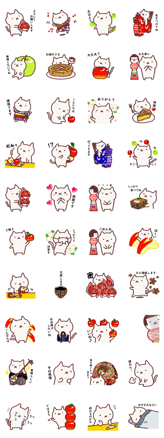 『普段使いの手描きねこ』第二弾。今回はりんごたっぷり。よく使う表現に津軽塗やねぶたなどの伝統文化、工芸品を合わせた便利なスタンプです。絵文字版もあります。