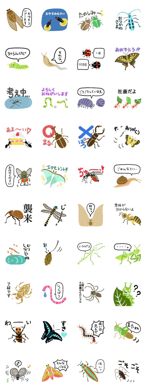 少しリアルでかわいい手描きの昆虫たちのスタンプです。 きもい?かわいい?虫がいる生活。 毎日使って虫たちを身近に感じよう! 【「毎日使えるスタンプ」特集】