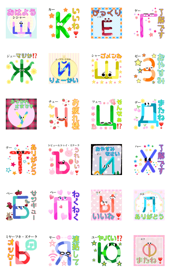 | スタンプ説明 | К(カー) Г(ゲー) Ж(ジェー) Ш(シャー) Э(エー) Ч(チェー) Ц(ツェー) Д(デー) Т(テー) Ъ(トヴョールドゥイ・ズナーク) Х(ハー) Б(ベー) П(ペー) Ь Ю Я |