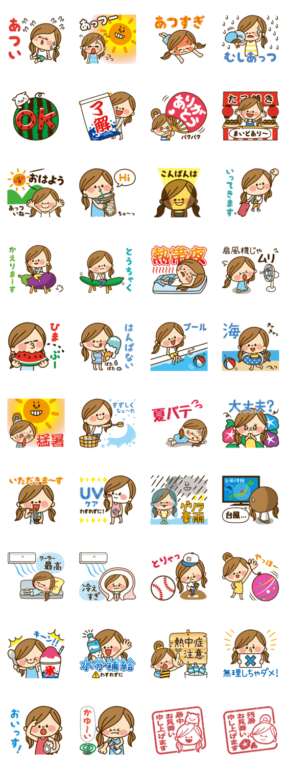 かわいい主婦の1日第8弾【真夏編】はかわいい女の子の真夏に使えるスタンプです。暑い真夏のパパや家族、ママ友達との毎日の会話にどうぞ。